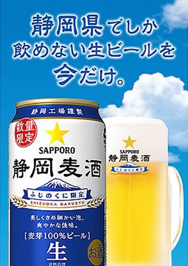 サッポロビール(株)は、静岡県内限定で樽生商品として販売している「静岡麦酒(しずおかばくしゅ)」の缶商品を、4月16日に数量限定で発売します。本商品は、当社の静岡県出身者が中心となって「静岡県の食材や料理にぴったりの、静岡県の乾杯にふさわしい、静岡県のためのビール」として2013年2月23日“富士山の日”に樽生商品を販売開始しました。